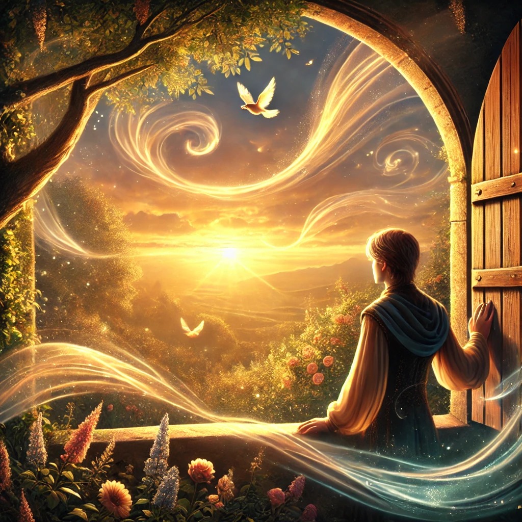 Seekor burung kecil hinggap di ambang jendela, mengepakkan sayapnya seolah membisikkan pesan: cinta ada di setiap detak kehidupan, bahkan di tengah kesedihan. Pangeran berhenti sejenak. Matanya menatap jauh ke luar jendela, ke arah taman di mana angin lembut menggerakkan bunga-bunga dengan penuh kasih. Burung-burung kecil terbang melintas, seolah ikut mendengarkan percakapan mereka.