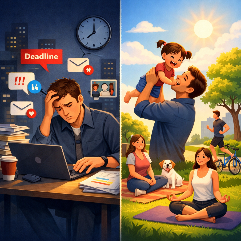 Work–life balance menekankan keseimbangan antara tuntutan pekerjaan dan kehidupan pribadi. Namun, perkembangan teknologi membuat batas itu semakin kabur.